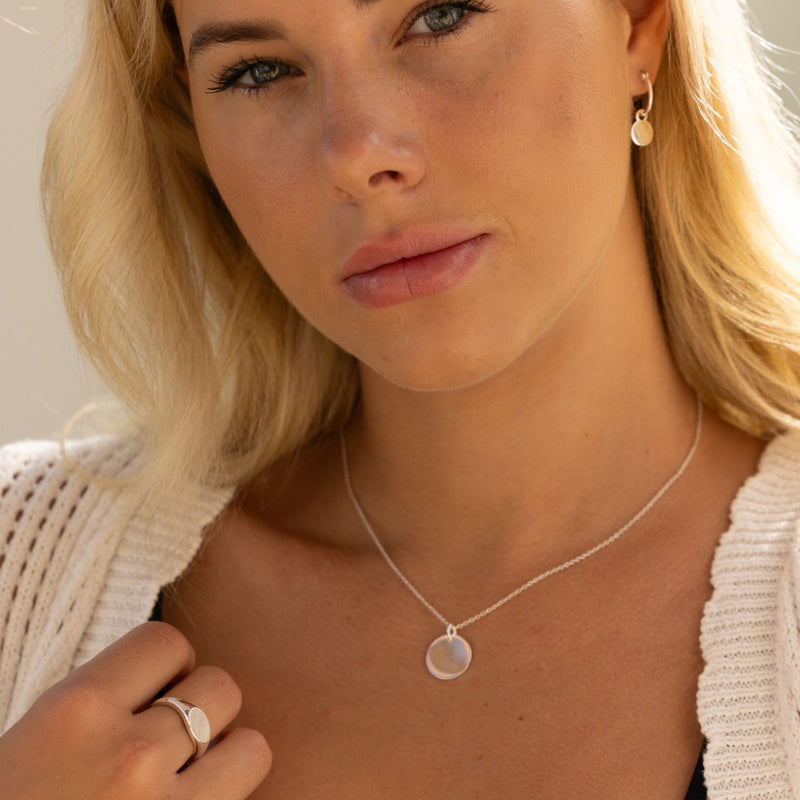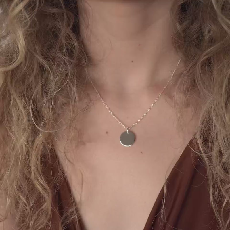 Our best-selling silver disc necklace is stylishly simple—the little black dress of jewellery! Available in solid sterling silver or stainless steel, this timeless piece is perfect for engraving a name, initials, short text, or a symbol.