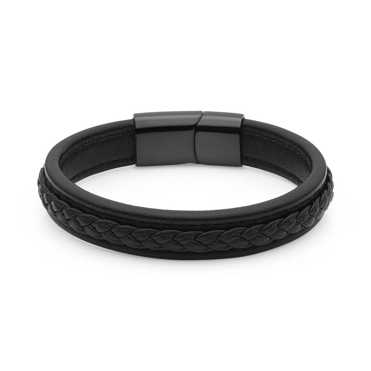 A modern, everyday bracelet crafted from genuine black leather with a flat band, detailed plaited centre, and clean stitched edges. The design is paired with a black stainless steel clasp featuring a strong magnetic slide‑lock closure that keeps the bracelet secure and comfortable all day.