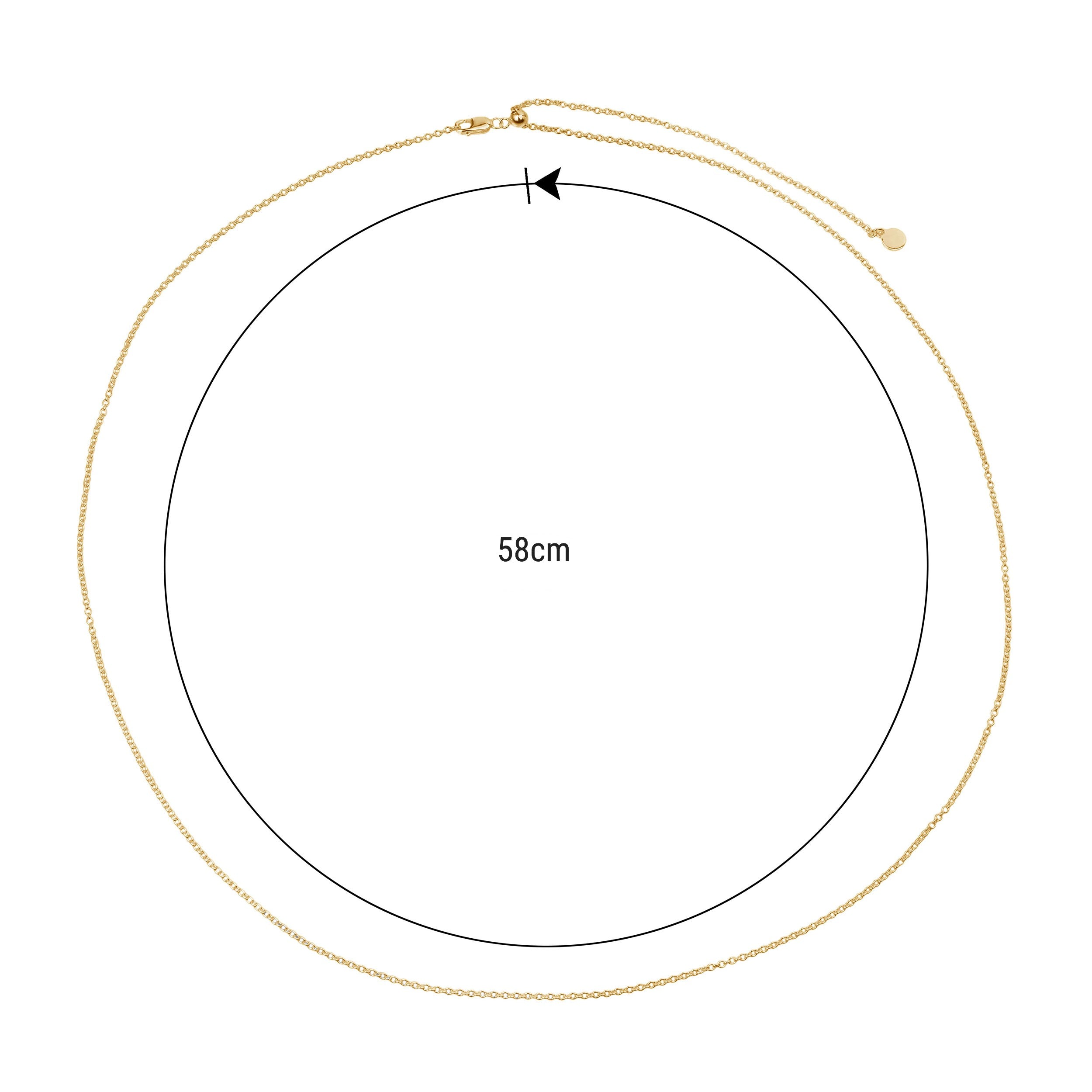 Sterling silver cable chain plated in yellow gold. 4.5gm, 58cm, 1.5mm thick with lobster clasp. The necklace has a sliding bead that can be used to adjust the length of the chain while you are wearing it so your pendant will always be at the perfect length for your outfit.
