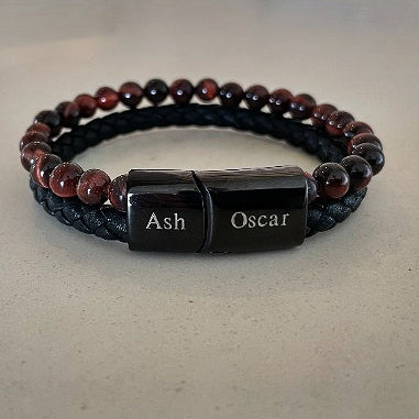 engrave clasp on mens leather and bead bracelet