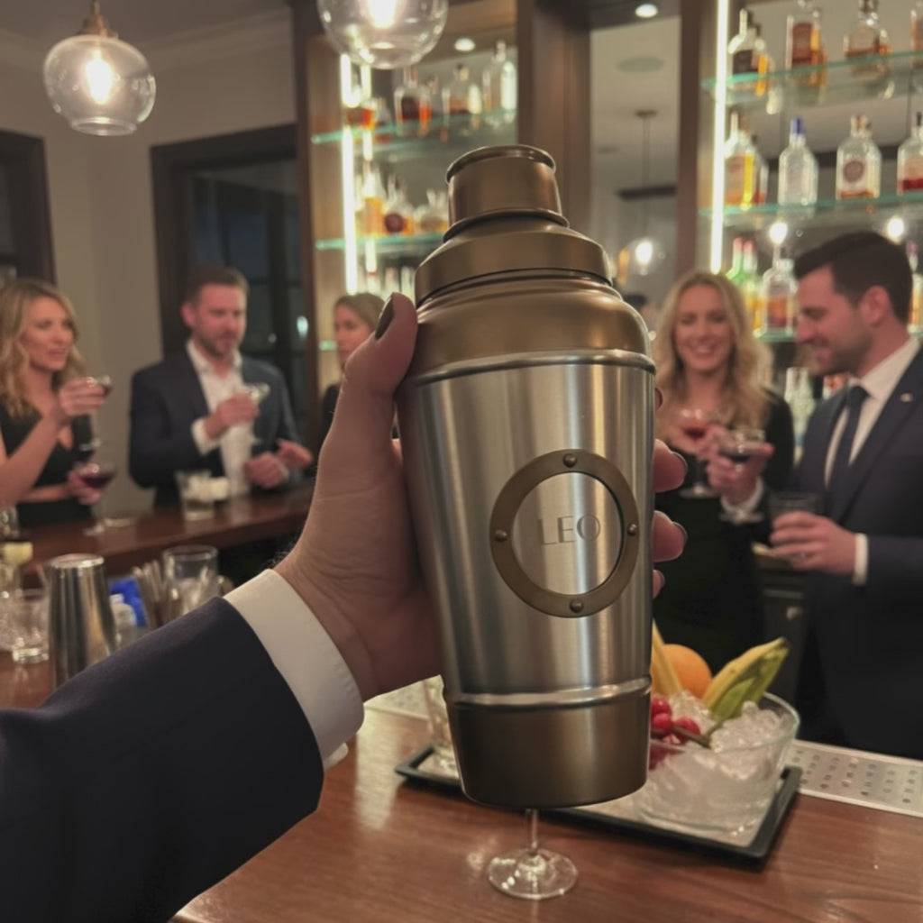 Personalised Steel & Antique Brass Cocktail Shaker and Tool Set