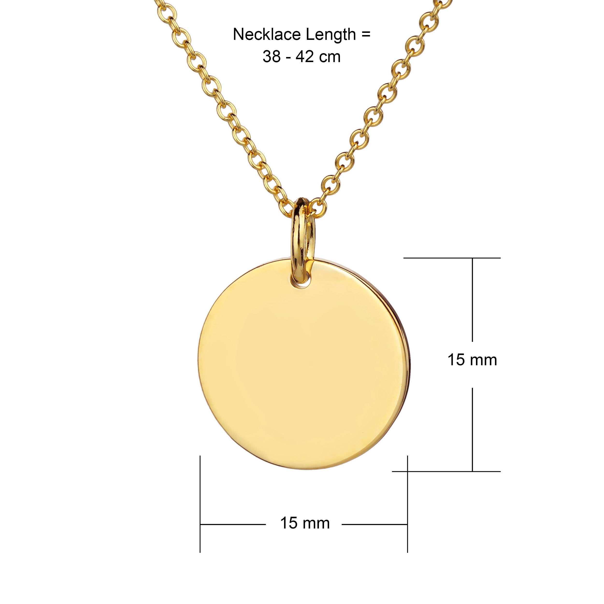 The disc pendant measures 15mm in diameter and 1mm thick, offering enough space for up to 30 characters. Engraving is available on both the front and back of the pendant, with best results achieved using up to six short words.