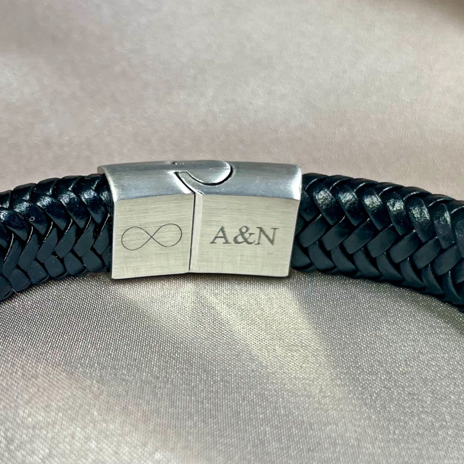 Black smooth braided leather bracelet with brushed steel magnet slide clasp. Engrave the clasp with a few words, initials, date or symbol.