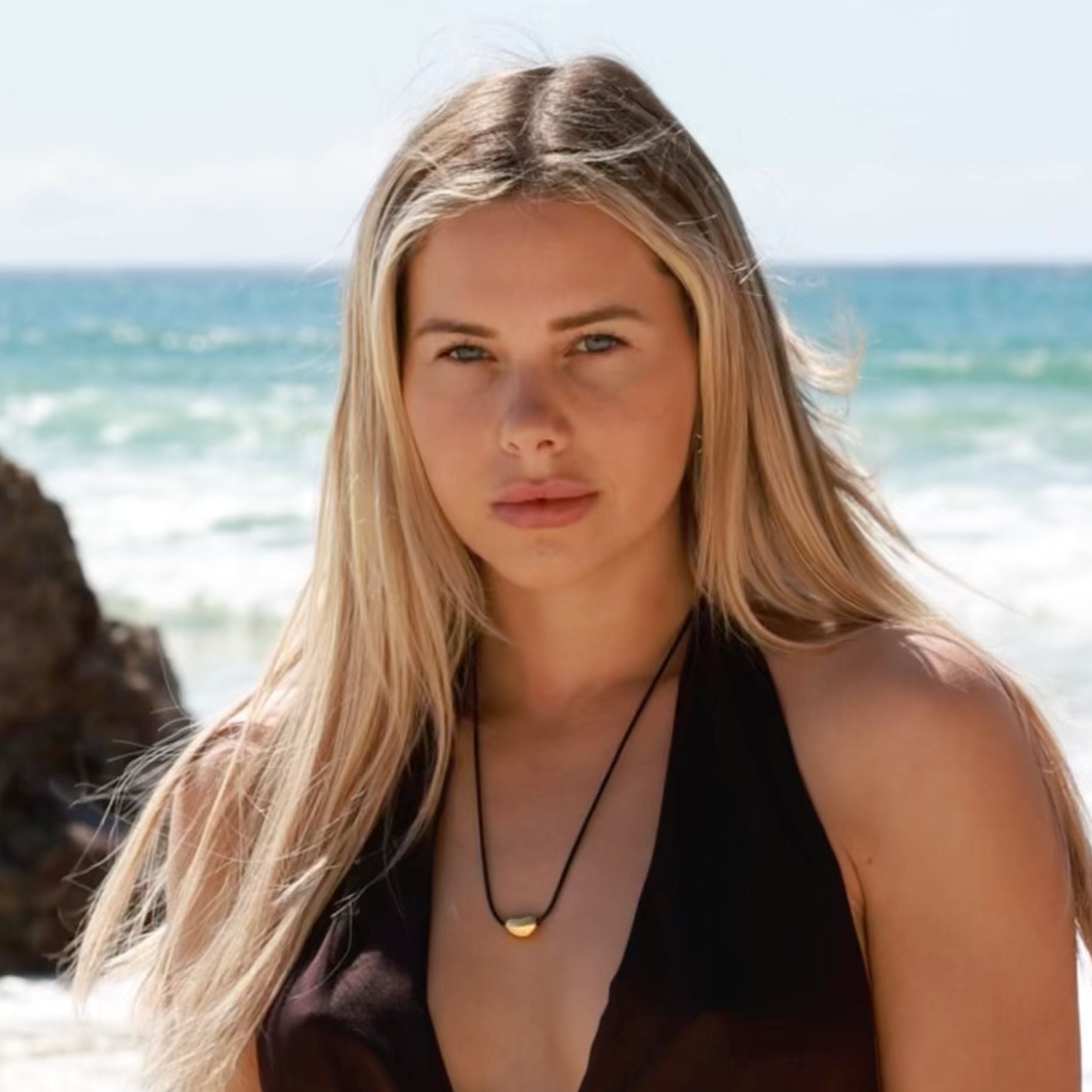 A refined gold pebble pendant, exquisitely crafted with a smooth, organic silhouette reminiscent of serene beach stones. Suspended on an adjustable waxed cord, this elegant piece offers understated sophistication.