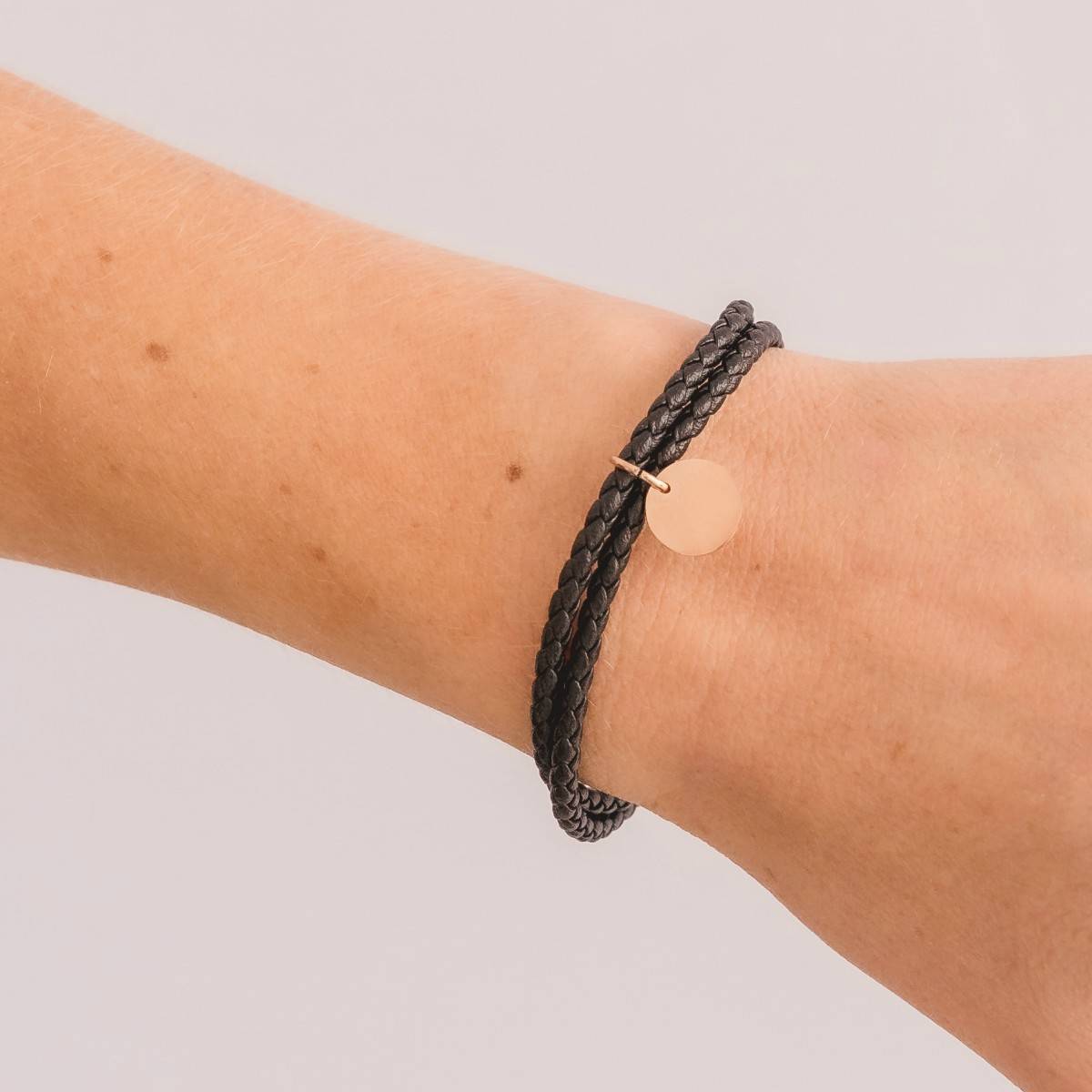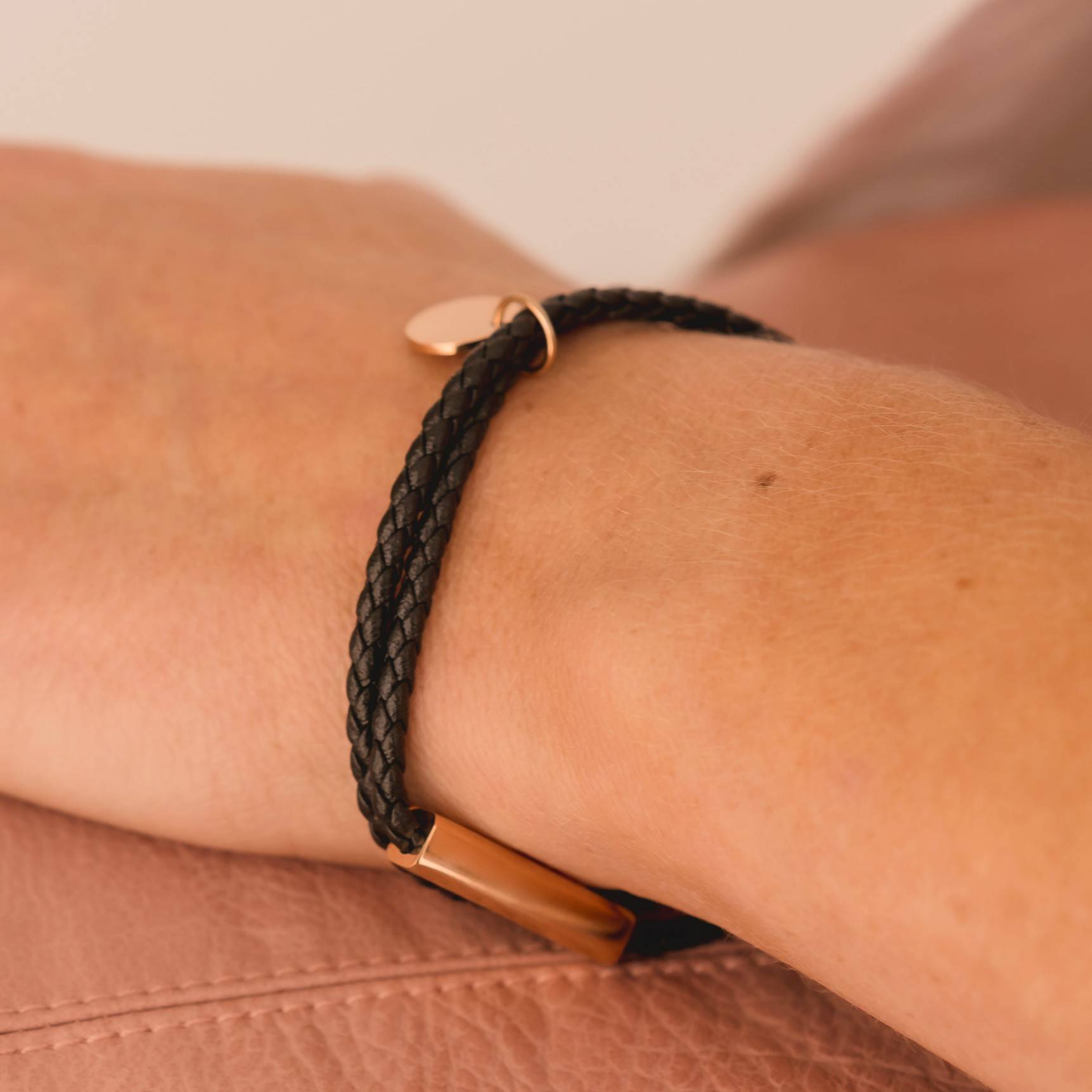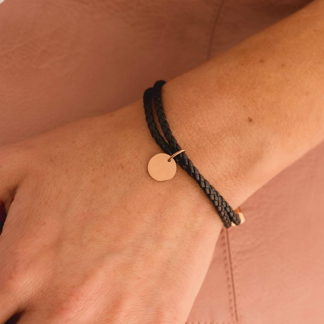 This leather bracelet mini disc bracelet is made from plaited black leather with a stainless steel magentic clasp and 10mm disc plated with rose gold. Both clasp and disc can be engraved.