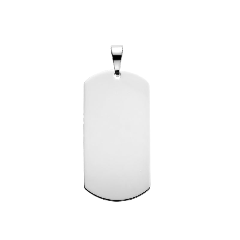 Engraved shiny stainless steel men's dog tag pendant. Personalise this men's necklace by engraving the steel dog tag. The dog tag pendant can be engraved on both sides.