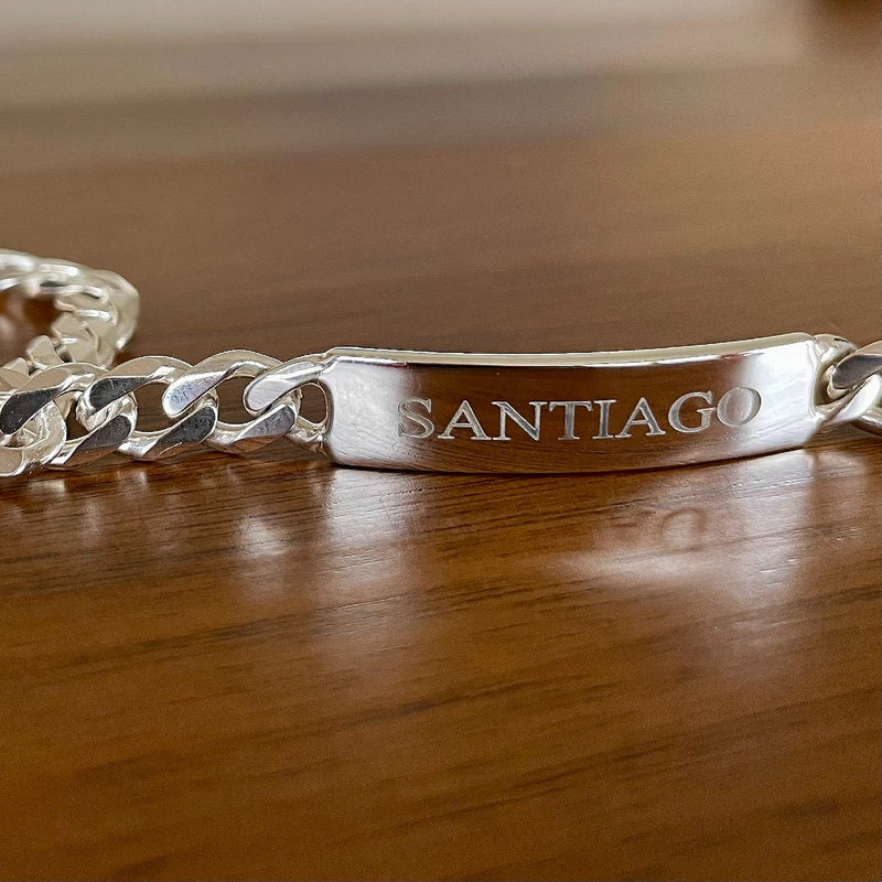 Elevate your style with our 250 gauge solid sterling silver men’s ID bracelet. Personalise with your choice of font on the 10mm x 38mm engravable plate.
