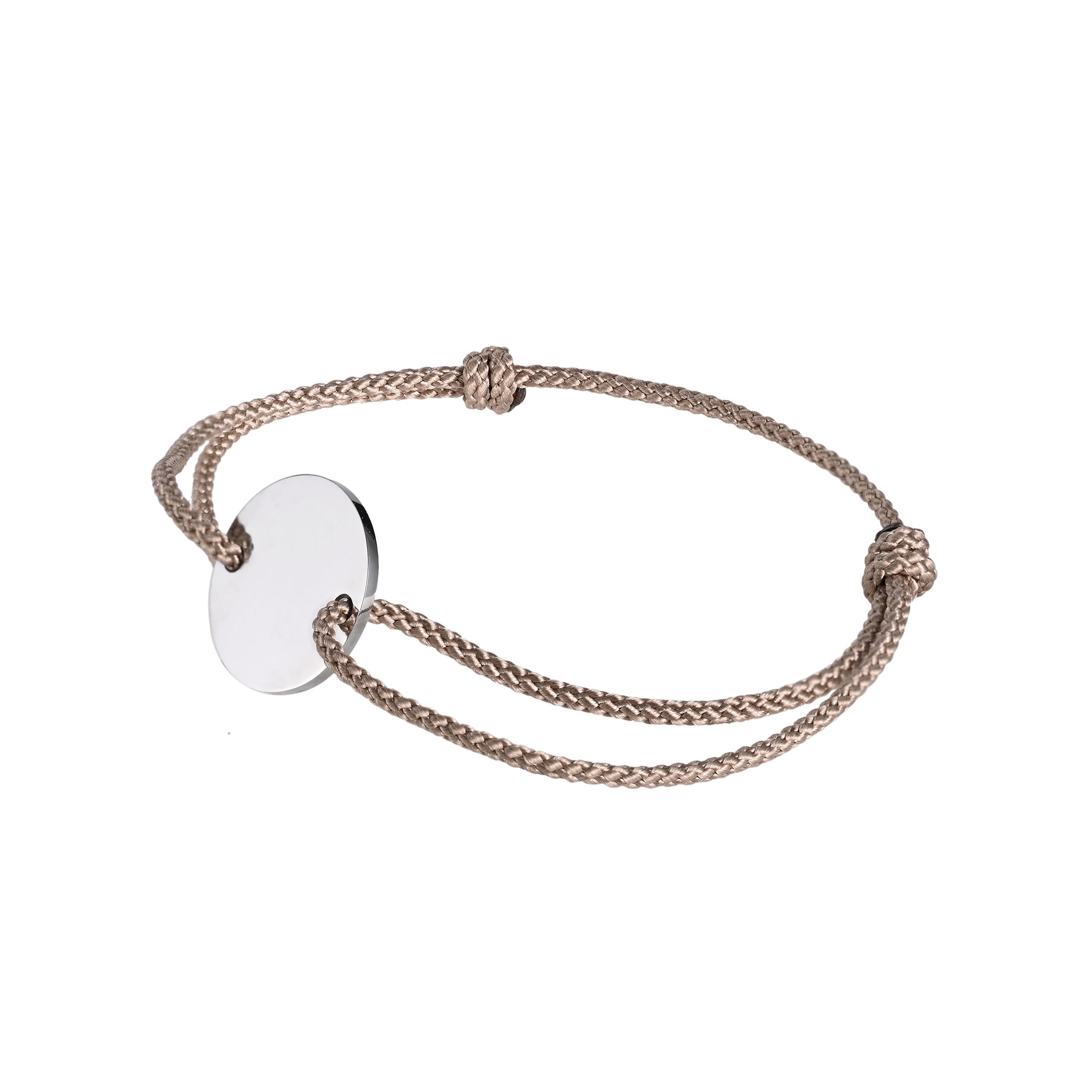We love the combination of rose gold and natural cord or shining silver. 925 sterling silver disc plated with rose gold with adjustable natural cord bracelet. The fine, adjustable-length cord makes it the ultimate layering accessory, and the perfect addition to everyday wear. The 15mm disc can be personalised on both sides by engraving your choice of text or symbols.
