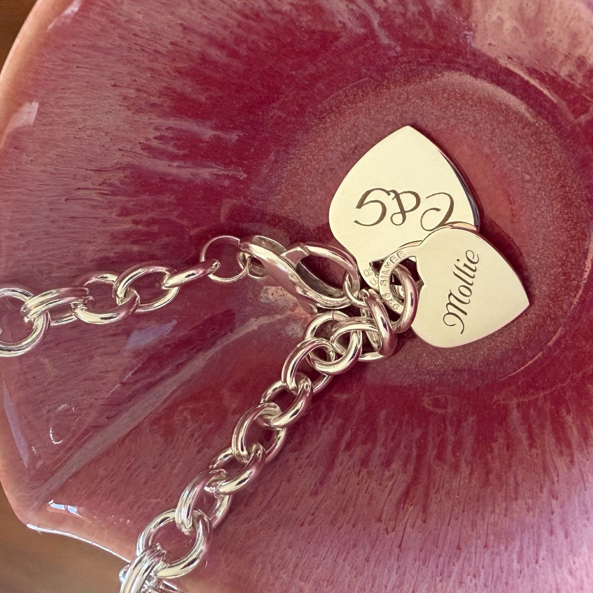 Personalisation: Both heart pendants can be engraved on the front and back with names, initials, dates, short words or symbols. You can also choose custom designs or handwriting to create a truly unique bracelet. This piece is ideal for marking meaningful connections or celebrating important milestones.