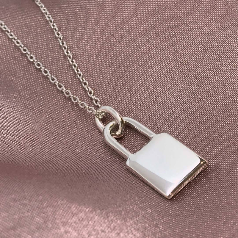 Lock necklace available in solid sterling silver or stainless steel. This mini padlock (10mm wide, 17mm high) can be engraved with up to 10 characters, perfect for initials, names, or a single symbol. Personalised engraving is available on both sides.
