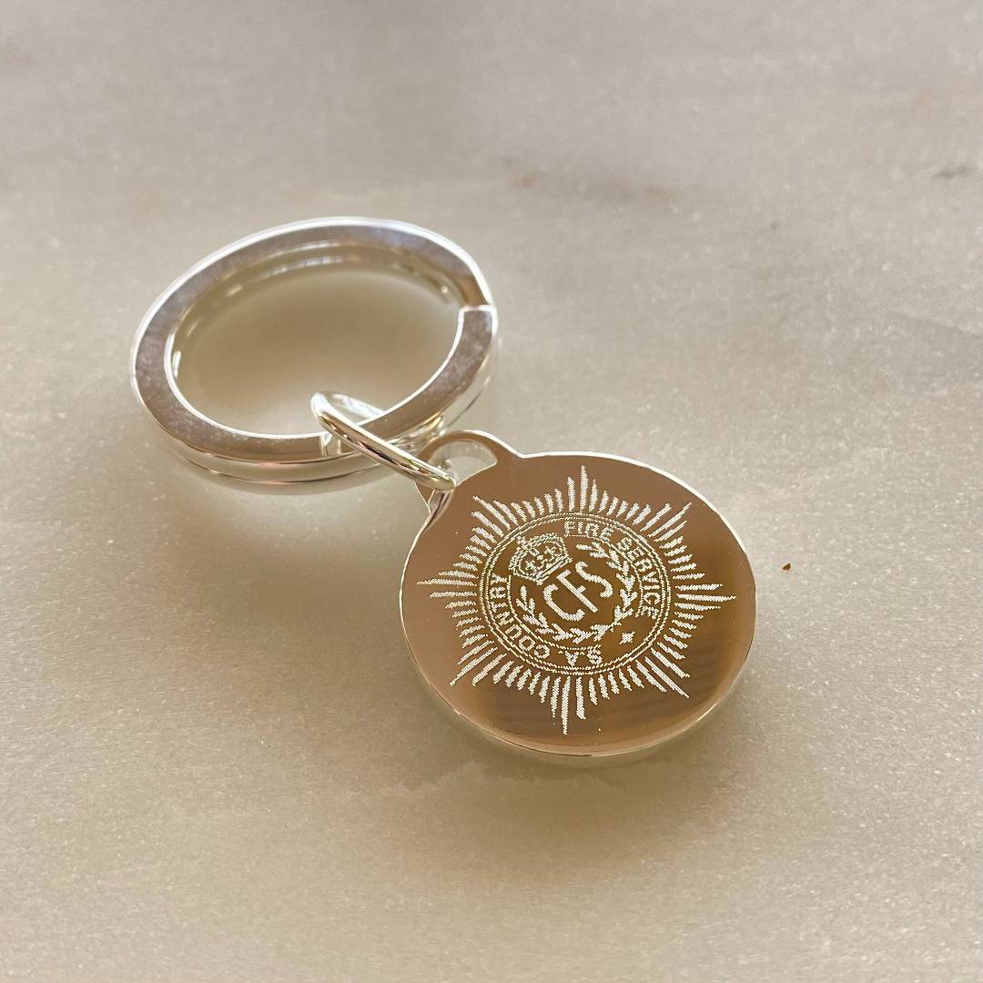 Disc is 25mm diameter x 2mm thick, with 30mm sterling silver split ring for keys.